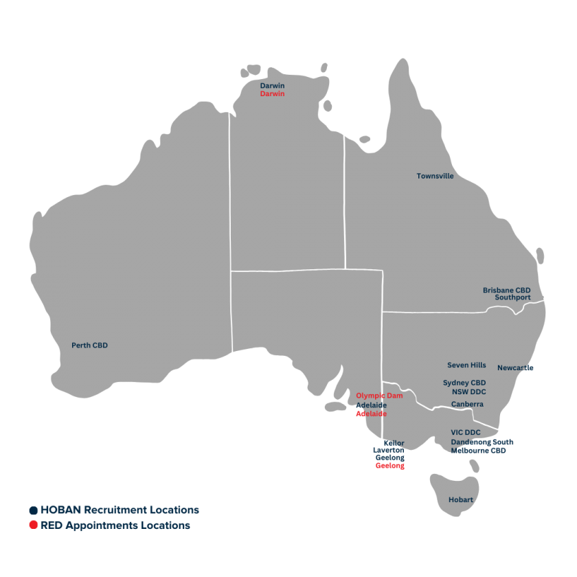 With 14 offices across Australia and HOBAN Recruitments’ international network of recruitment partners, RED Appointments is uniquely positioned to support your staffing needs across multiple regions and industries. We leverage six decades of expertise, using deep industry knowledge to understand the changing dynamics of the workforce, ensuring that our partners are always ahead of the curve.